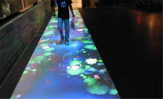 地面互動投影系統采用懸掛在頂部的投影設備把影像效果投射到地面,當人走至投影區域時,通過系統識別,他們可以直接使用雙腳或動作與投影幕上的虛擬場景進行交互,各種互動效果就會隨著人的腳步產生相應的變幻。